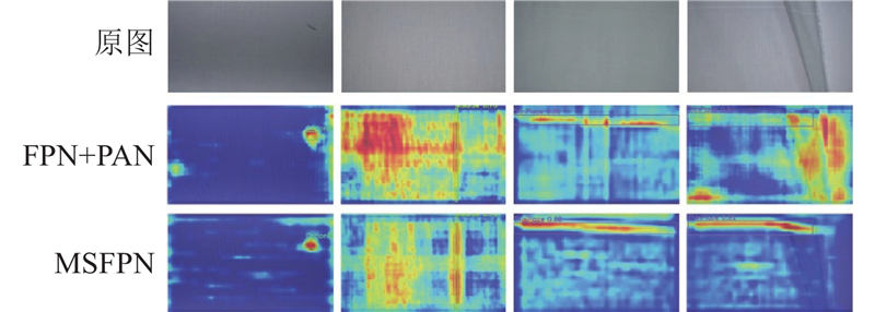 将FPN+PAN与MSFPN在ZY数据集上执行Grad-CAM可视化对比,如图9所示. MSFPN将特征信息进行直接交互,减少了信息损耗使得网络拥有足够的信息以精确关注缺陷区域,并在一定程度上抑制了非缺陷区域以及对织物纹理干扰因素具有一定的鲁棒性. 相比之下,YOLO采用的FPN+PAN组合网络会被织物纹理背景及布匹隆起因素干扰,从而错误地关注许多非缺陷区域.