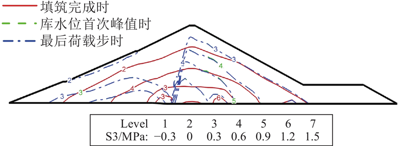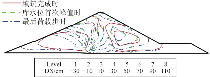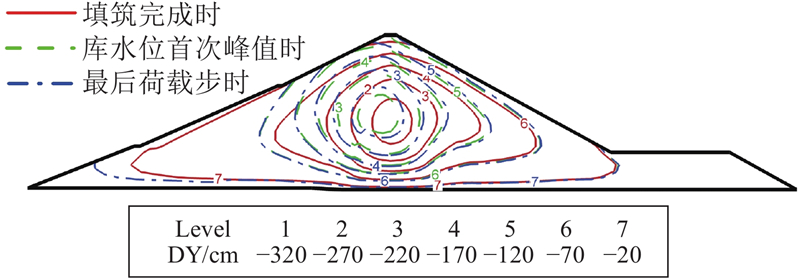 如图13所示为大坝0+240断面的沉降DY分布图. 其中,红色实线表示填筑完成时的沉降,此时尚未蓄水,上下游侧竖向位移对称分布,最大沉降位于1/2坝高处,满足一般规律. 绿色虚线表示库水位首次达到峰值时的沉降,此时上游堆石区受湿化变形影响,沉降显著大于下游,最大沉降向上游侧偏移. 蓝色虚点线表示最后一个荷载步的沉降,与前一时刻相比,位移分布规律变化不大,仅数值稍有增加,表明大坝沉降变形基本稳定.
