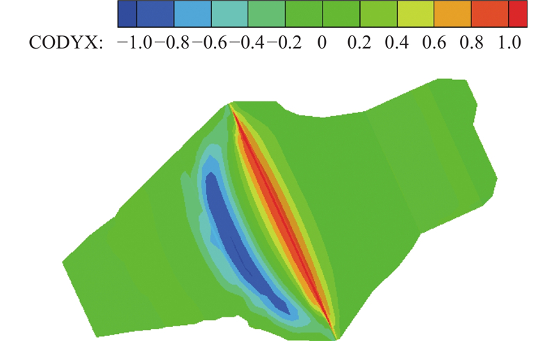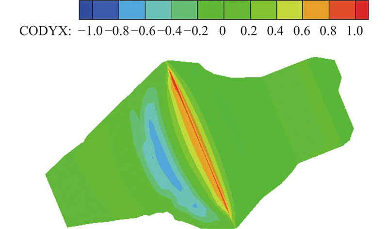 变形倾度法是当前分析土石坝表面裂缝的主要方法之一. 为了分析大坝出现裂缝时刻的变形倾度,利用有限元模拟结果计算不同时刻大坝表面的变形倾度. 如图17所示为大坝首次出现裂缝时刻的坝体表面顺河向变形倾度云图. 其中,CODYX为变形倾度,即2点间Y方向变形差(沉降差)与X方向距离(顺河向水平距离)之比的百分值. 从图中可以看出,坝顶部分区域的变形倾度大于1%,可能出现裂缝. 这些区域与实际裂缝发生情况相符.