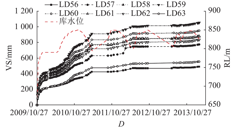 经过一轮水位升降周期后,各测点沉降增幅不断减缓,无明显随水位变化的趋势. 所有测点的沉降变形过程均符合大坝发生流变和湿化变形的特点. 同时,各测点沉降在同一时刻基本以大坝最高断面为中心对称分布,越靠近大坝最高断面的测点沉降越大,这表明沉降与测点所在断面的坝体高度密切相关.