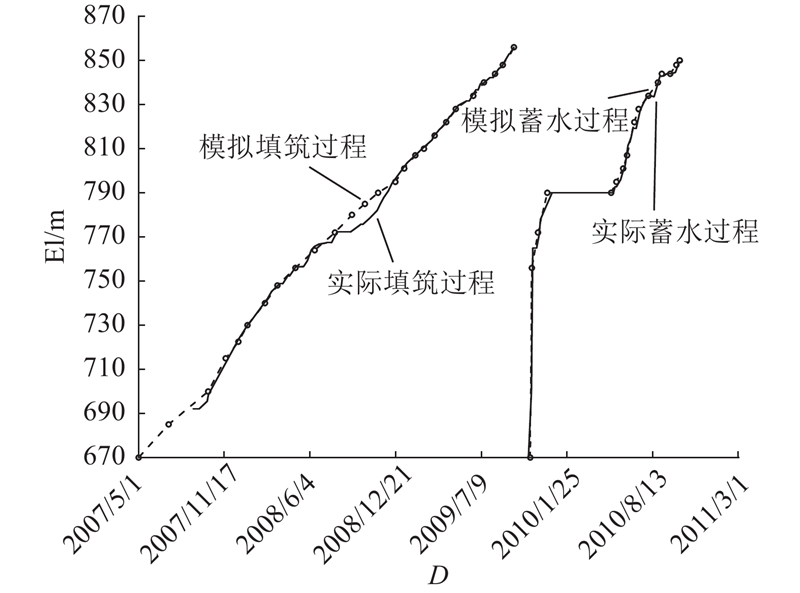 土石坝的变形是由自重荷载、湿化、流变效应等多种力学因素作用形成的,故其监测数据是瞬时、流变与湿化变形的耦合值[17]. 土石坝数值模拟应针对不同力学成因选用相应模型,如静力本构、流变模型、湿化模型等,以体现力学成因的对应关系. 当前土石坝参数反演中,多数将施工期变形视为瞬时变形、蓄水期视为湿化变形、稳定运行期视为流变变形,分时段进行各模型的参数反演,未考虑各时期监测数据其实是几种变形的耦合值,并未将力学成因的一一对应关系体现出来[18];亦有学者直接进行多模型参数联合反演,但过程复杂且结果可靠性有限. 因此,须结合大坝数值模拟力学模型和监测资料力学成因分析,对监测数据进行力学成因解耦,分别反演对应的本构和模型参数,以提高土石坝参数反演的合理性和可靠性.