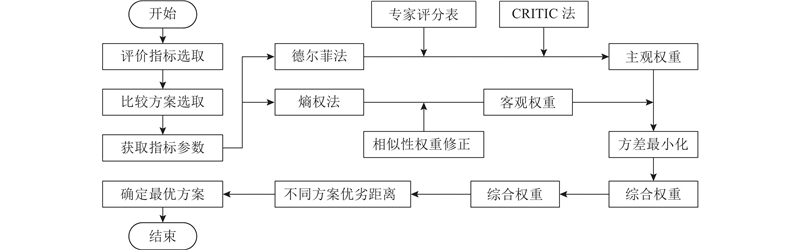 不同评价指标的重要性各异,须通过权重系数反映其影响. 在确定指标及计算方法后,须科学赋权以构建完整评价体系,确保其准确性和科学性[14]. 本研究采用改进德尔菲法(基于CRITIC法修正专家经验)和修正熵权法(相似性误差改进)分别作为主客观评价方法,通过方差最小化组合赋权,实现主客观权重的综合优化,并运用集对分析遴选最优建设方案.