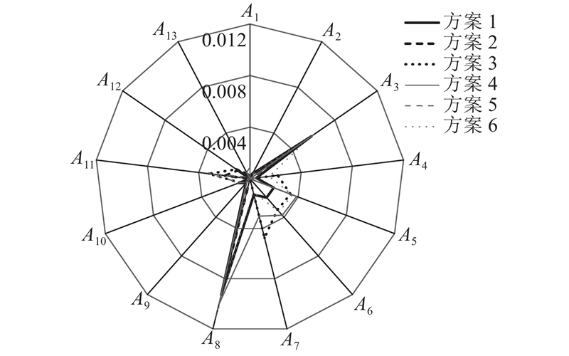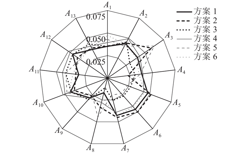 由图8可以看出,方案3与其他5个方案的对立度普遍偏低,各指标间未出现显著对立情况. 说明方案3与其他方案在评价指标上具有较好的协调性,能兼顾不同方案之间的关联性,从而获得更可靠的评估结论.