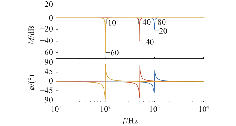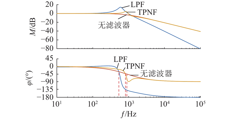 在传统脉振高频电压注入法中,LPF被用于滤除电流回路中注入的高频电流信号. 然而,LPF的使用不仅无法完全将高频信号滤除,又会导致电流回路中信号幅值衰减和相位延迟,严重影响系统的动态性能. 为了弥补传统脉振高频电压注入法的不足,采用三参数陷波器将高频电流信号滤除. 相比于传统的LPF策略,TPNF可实现对特定高频信号的完全滤除,同时无幅值衰减和相位延迟地保留基波低频信号. 相比于其他陷波结构,TPNF可以在不增加陷波器阶数的前提下改变陷波深度,陷波带宽、陷波中心频率适应性更强. TPNF传递函数为