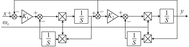 传统位置信息提取采用BPF+LPF结构,导致位置信息存在延时、信噪比低的问题. 为了弥补传统方法的不足,本研究采用四阶广义积分器和三参数陷波器的方法. FOGI是一种可以对特定频率信号实现零延迟提取的滤波结构,其结构图如图12所示. 其中,x为输入信号,ωr为待处理的信号频率,y为经过滤波处理后的信号. FOGI包含2个广义积分环节,K1、K2为比例系数,调节其值可以改变其选频特性.