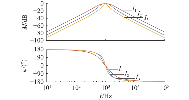 如图13所示为FOGI在不同参数下的伯德图. 提取信号频率为1 kHz,I1参数如下:K1=0.70、K2=2.00;I2参数如下:K1=0.48、K2=1.10;I3参数如下:K1=0.20、K2=1.20. 从图中可以看出,虽然不同K1、K2影响了FOGI的带宽,但在特征频率点处,不同参数对系统响应的幅值并无影响,且无相位偏移. 因此,FOGI可以改善系统由BPF所引起的相位延迟的问题. 从图中也不难看出K1、K2的改变会引起FOGI带宽的改变,从而影响到对特定频率信号的提取. 因此,须合理设计四阶广义积分器参数.