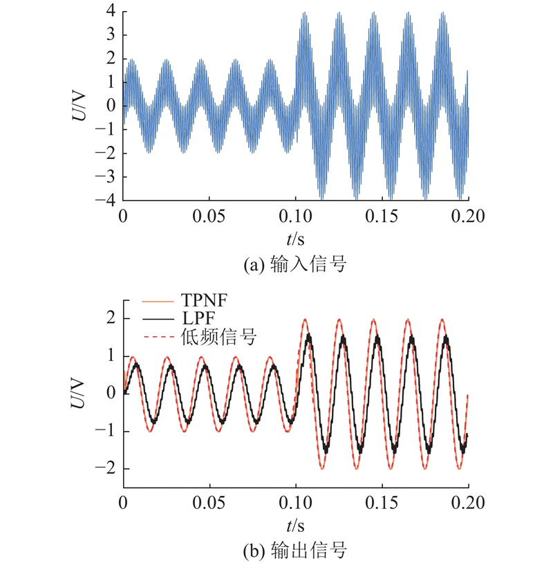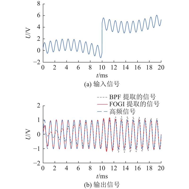 如图14所示为FOGI与BPF信号提取能力的结果比较,其中设定输入信号频率为1 kHz,幅值为1 V的正弦信号,叠加频率为50 Hz,幅值为1 V的正弦信号,并在10 ms时增加一个幅值为 5 V的阶跃信号. 如图14(a)所示为输入信号波形图,如图14(b)所示为经过提取后的信号输出波形图. 从图中可以看出,BPF和FOGI都能实现对高频信号的提取,但是,BPF有明显的信号延时,而FOGI不存在这种问题,此外,在阶跃信号的作用下,BPF和FOGI都产生了一定的高频振荡,但FOGI可以更快地恢复对高频信号的正常提取,时间约为2.5 ms,并且无相位延迟,而BPF不仅有相位延时,恢复正常提取的时间也更长. 因此,FOGI在消除相位延迟的同时,可有效提高系统的动态性能.