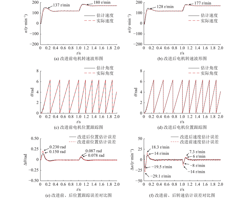 仿真实验时间为2 s,空载状态下,电机初始给定转速为120 r/min,在1 s时将给定转速调整为170 r/min,电机的仿真波形图如图16所示. 在启动时,传统脉振高频电压注入法的转速估计误差最大约为29.1 r/min、转子位置跟踪误差最大约为0.230 rad,转速最高约为137 r/min;在转速突变时,转速估计误差最大约为14 r/min,转子位置跟踪误差最大约为0.087 rad,转速最高约为180 r/min. 相比之下,改进脉振高频电压注入法,在启动时,转速估计误差最大约为19.5 r/min、转子位置跟踪误差最大约为0.150 rad,转速最高约为128 r/min;在转速突变时,转速估计误差最大约为8 r/min,转子位置跟踪误差最大约为0.078 rad,转速最高约为177 r/min,此外,在转速平稳时,转速波动得到明显的改善,较平滑. 通过分析可知,改进后的脉振高频电压注入法相较于传统脉振高频电压注入法,在启动和目标转速突变的瞬间,转速误差、位置误差都更小,动态性能更好,具有更优的控制性能.