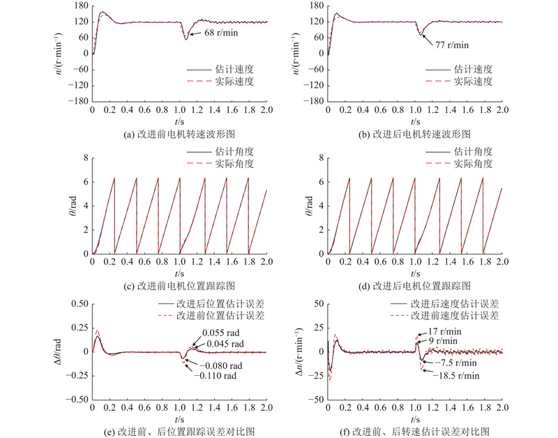为了验证改进后的脉振高频电压注入法抗干扰性能强于传统脉振高频电压注入法,针对负载突变工况进行如下仿真验证. 仿真实验时间为2 s,电机起始转速为120 r/min,在稳定运行1 s后,突然增加额定转矩的50%(0.11 N·m)并持续到仿真验证结束,仿真波形图如图17所示,对比改进后脉振高频电压注入法和传统脉振高频电压注入法的电动机转速、转子位置、转子位置误差来进行结果分析. 由图17可以看出,电机加载后,改进前、后电机控制系统都能达到控制效果. 然而,传统脉振高频电压注入法下,加负载后电机转速下降到约68 r/min,并且转速估计误差波动最大约为18.5 r/min,位置估计误差最大约为0.110 rad. 相比之下,改进后的脉振高频电压注入下加载后电机转速下降到约为77 r/min,并且转速估计误差波动较小(最大约为9 r/min),位置估计误差最大约为0.080 rad. 综上,改进后方法的抗干扰性能优于传统方法.