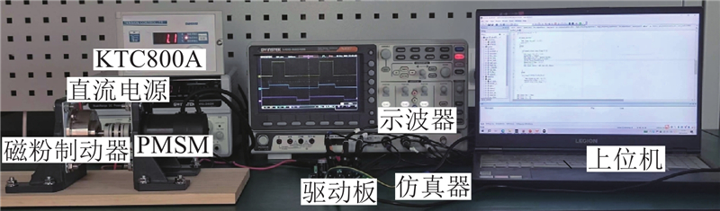 为了进一步验证本研究所提基于三参数陷波器的脉振高频电压注入永磁同步电机无位置传感器控制策略的有效性,构建了实验验证平台. 该平台以STM32F446RE芯片为主控单元,包括PMSM以及驱动板、上位机、示波器、直流电源、加负载用磁粉制动器及其数显控制器KTC800A,如图18所示. PMSM电机参数如表2所示. 实验过程中,通过电机内置的编码器获取电机转子的实际位置和转速信息,并与估计的转子位置和转速信息作比较. 实验中产生的数据由控制器通过串口通信实时发送到上位机中实时显示并保存,实验结束后将数据导出进行分析. 实验中,母线电压为24 V,注入脉振高频电压幅值为15 V,注入脉振高频电压频率为1 kHz.