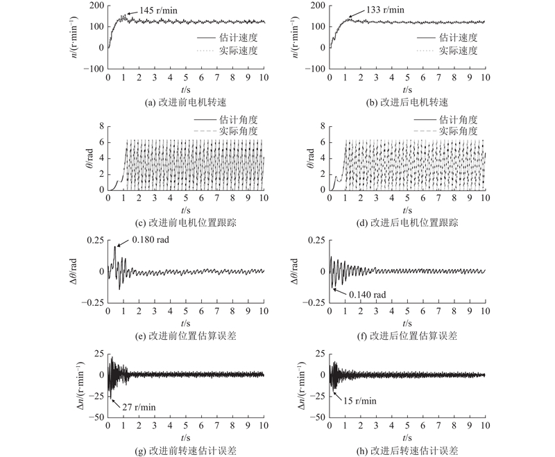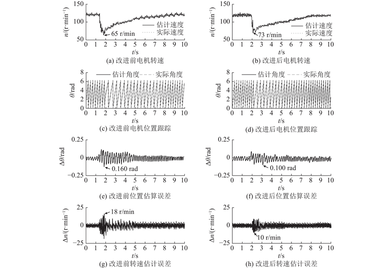 在空载状态下,改进后脉振高频电压注入与改进前的脉振高频电压注入电机启动实验对比如图19所示. 起始状态下电机处于静止状态,0 s时,给予电机启动命令,目标转速为120 r/min. 从图中可以看出,改进前的脉振高频电压注入启动所用时间约为1.8 s,转速最高约为145 r/min,转子位置估算误差最大约为0.180 rad,转速估计误差最大约为27 r/min. 改进后的脉振高频电压注入启动所用时间约为1.40 s,转速最高约为133 r/min,转子位置估算误差最大约为0.140 rad,转速跟踪误差最大约为15 r/min. 由上述分析可知,改进前、后的脉振高频电压注入均实现了在低速域状态下的电机启动,并且,位置估计误差和速度估计误差均经历先增大、后减小、最终趋于平稳的过程,但是,改进后的脉振高频电压注入在电机启动过程中的动态性能和转子位置估计精度均优于改进前的脉振高频电压注入,然而,在电机启动时的动态性能和转子位置估计精度上,改进后的脉振高频电压注入优于改进前的脉振高频电压注入.