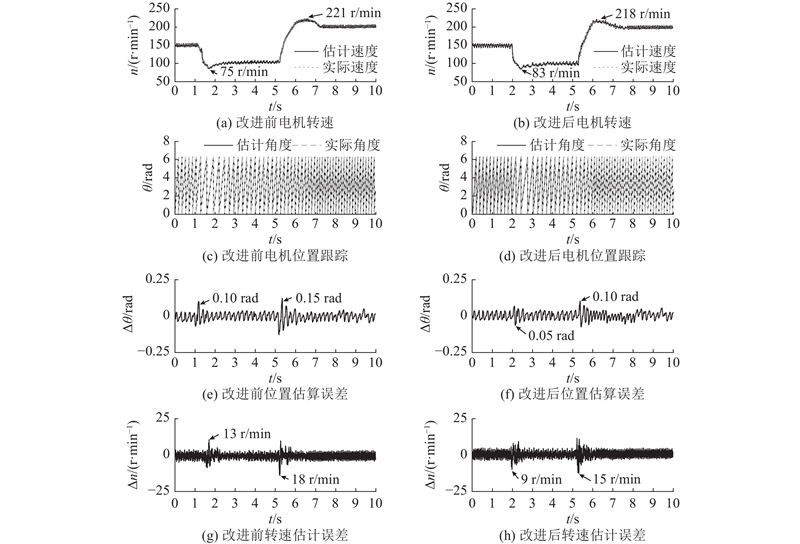 为了验证本研究所提策略的速度响应能力优于传统方法,在电机在加额定负载50%(0.11 N∙m)的状态下,对改进前、后脉振高频电压注入的电机进行转速突变对比实验,结果如图21所示. 令PMSM无位置传感器控制系统实验平台中的电机以150 r/min运行,经过减速后以100 r/min运行一段时间,随后加速到200 r/min. 从图中可以看出,在150 r/min到100 r/min减速阶段,改进前所用时间约为1.8 s,转速最低约为75 r/min,转速估计误差最大约为13 r/min,位置估算误差最大约为0.100 rad. 改进后所用时间约为1.3 s,转速最低约为83 r/min,转速估计误差最大约为9 r/min,位置估算误差最大约为0.050 rad. 从100 r/min到200 r/min加速阶段,改进前所用时间大概为2.2 s,转速最高约为221 r/min,转速估计误差最大约为18 r/min,位置估算误差最大约为0.150 rad. 改进后所用时间约为1.8 s,转速最高约为218 r/min,转速估计误差最大约为15 r/min,位置估算误差最大约为0.100 rad. 由上述分析可知,改进前后系统均可以有效跟踪转速和位置的变化,虽然转速估计误差和位置估计误差在转速突变时最大,但经过一段时间后均可恢复平稳,此外,相比于改进前,改进后的脉振高频电压注入能更有效且更快速地跟踪真实转速,动态性能更优.