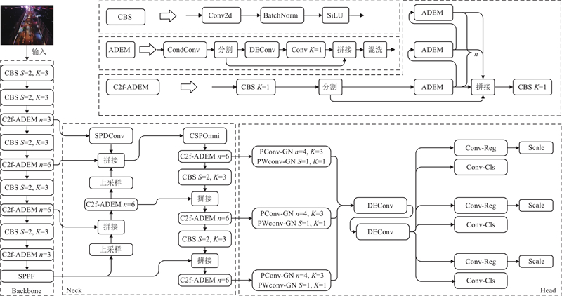 针对航拍图像中密集小目标检测困难的问题,已有一些研究成果. Zhu等[1]提出TPH-YOLOv5算法,增加小目标检测头以应对目标尺度的剧烈变化,利用Transformer检测头(TPH)替换原检测头,以准确地在高密度场景中定位对象,同时融入卷积注意力模块(convolutional block attention module, CBAM),帮助网络在覆盖大范围区域的图像中找到感兴趣的区域. Luo等[2]对YOLOv5模型进行改进,采用不对称卷积增强骨干网络的特征提取能力,并加入改进后的高效通道注意力模块,使网络更好地关注特定的局部信息,最后提出EIoU-NMS方法,从而更有效地抑制冗余预测框. 宋耀莲等[3]基于YOLOv5模型提出FDB-YOLO算法,通过添加小目标检测层优化特征融合网络,提高了浅层特征的利用率,其次构建新的损失函数FPIoU,通过四点定位方式显著提升损失函数的收敛速度和定位精度,最后在特征提取网络中加入双向路由注意力机制,以提升模型对重点特征的关注度并有效过滤无关特征. 邓天民等[4]基于YOLOv8模型提出一种自适应复合卷积模块,摒弃背景信息,自适应调节有效特征的输出,并利用空间上下文金字塔(SCP)的子分支替换空间金字塔池化(SPPF)模块,减少冗余信息的生成,最后提出轻量化T型感知检测头,采用参数共享的方式,在保持对多尺度特征信息敏感的同时降低模型计算开销.