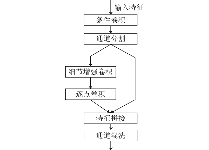 针对上述问题,提出自适应细节增强模块ADEM,其结构如图2所示. 条件卷积CondConv[10]通过为每个输入样本生成条件向量,并利用该向量动态地调整多个基础卷积核的权重组合,使卷积层能够适应不同样本对特征的需求,提升模型的灵活性和表达能力. 随后,输入特征映射被分割为2条分支,每条分支的通道数是原来的一半. 细节增强卷积DEConv[11]通过引入差分卷积捕捉像素之间的差异,提升对高频信息的关注,从而更好地提取图像细节和纹理特征. 为了降低细节增强卷积的参数量,采用深度卷积的思想,分别为标准卷积和差分卷积的每个通道应用不同的卷积核,以减少计算复杂度. 在通过逐点卷积融合各通道信息后,将2条分支合并,利用通道混洗增强各分支间的信息流动,进一步提升模块的特征学习能力和计算效率.