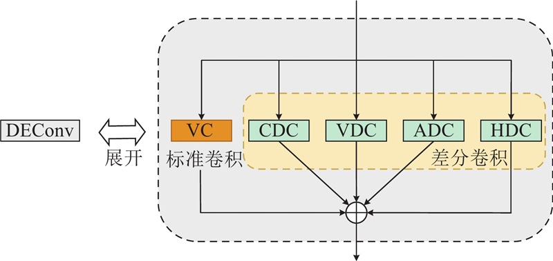 细节增强卷积DEConv包含2个主要步骤:1)通过差分卷积增强高频信息的捕获;2)通过标准卷积提取低频特征. 结构如图4所示. DEConv并行采用4个差分卷积来提取高频信息. 训练开始时,4种差分卷积设定的权重更新方式为