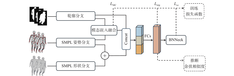 ... 首先,现有方法更关注模态之间的融合,缺乏对各模态分支特征提取的针对性优化. 如Zheng等[20 ] 采用全连接网络学习SMPL模型的步态信息,结构较简单,难以充分捕捉姿态变化的时序特征;Dong等[21 ] 通过提取22个关节点并转换为特征图来进行融合,虽考虑了姿势信息,但其方法在Gait3D上准确率仍不足54%,表明关键姿势信息在转换中存在一定丢失,同时也未能有效利用SMPL模型所包含的静态形状特征. 这些方法未能充分挖掘SMPL模型包含的形状信息和运动姿势信息,影响了特征的有效表达. 其次,由于不同模态在数据形式上的差异,模态融合过程中的特征对齐成为关键问题. 现有方法尝试从不同角度进行对齐. 例如,Dong等[21 ] 使用K最近邻法对齐轮廓特征与SMPL模型的姿势特征,虽能实现局部特征匹配,但难以建模全局语义关联;Zou等[17 ] 通过交叉注意力机制,动态搜索骨骼和轮廓各部分之间的关联权值进行对齐融合,虽提升了特征对齐的灵活性,但无法量化模态间对齐的程度,且缺乏对模态间表征一致性的显式约束. 这些方法在一定程度上实现了模态间的特征对齐,但普遍存在缺乏特征一致性约束和语义对齐机制不完善的问题,进而限制了跨模态特征融合的有效性. ...