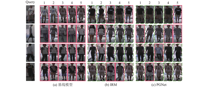 2.4. 实验结果可视化分析 基线模型仅采用HRNet进行特征提取,并利用由BN层生成的特征表示进行身份预测. 图5 为PGNet、基线模型和IRM在PRCC数据集上的可视化测试效果对比图. 为了全面评估算法性能,从待检测集query中选择4张行人图像,分别代表正面、侧面、背面以及光线较暗环境这4种典型场景. 从检索结果中选取与待检测图像相似度排前5的图像,虚线边框表示检索结果与待检测图像的行人ID一致,实线边框则为不一致. 可以看出,基线模型的检索性能存在显著局限性. 在多个场景的检索图像中,行人着装与待检索行人的服装相似,这表明基线模型在应对因服装相似导致的检索失败问题时,处理能力存在不足. 尤其在面对不同姿态变化,如行人转身等情况时,其表现出明显缺陷. 相比之下,PGNet的检索效果明显优于基线模型. PGNet运用双分支特征提取融合策略,在服装变化的情况下,能够有效提取与服装无关的判别特征,大幅减少了因服装相似导致的错误检索. 相较于IRM算法,PGNet方法在首位命中率方面表现更优. 特别是在正面视角和低光照环境下,PGNet展现出更高的识别准确率,表明其对光照变化的鲁棒性更强. 然而,在行人侧身姿态下,PGNet的检索性能受到一定影响. 即便如此,相比于IRM算法,PGNet在排序前2的高相似度检索结果的平均准确率上仍然具有优势. 例如,在图5 展示的侧身姿态检索示例中,PGNet的前2个检索结果中正确匹配的数量相对更多,体现了其在该场景下的相对优势. ...
