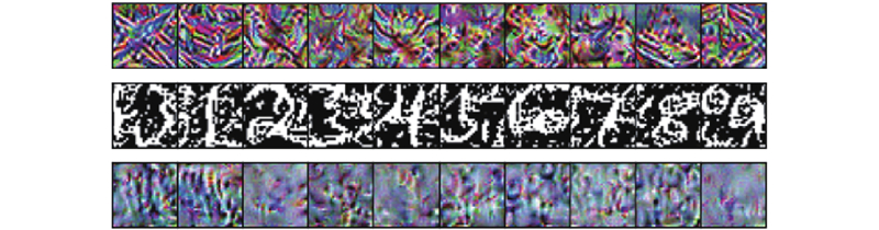 传统通用对抗扰动(universal adversarial perturbation, UAP)的生成方法需要大量数据用于模型训练和扰动生成,而在无数据场景下无法获取相关数据。因此,Mopuri等[27]提出基于类印象的无数据UAP生成方法. 利用模型在训练过程中留存的有关训练数据的记忆,生成能够使分类模型强烈地认为其属于底层数据分布中某一类别的虚拟样本. 图1为使用模型VGG16[28]生成的关于数据集CIFAR10[29]、SVHN[30],以及使用经典模型LeNet生成的关于数据集MNIST[31]中10个类别的类印象图. 类印象图不依赖于真实数据集,并且能够模拟分类模型对某一类别的“认知”,因此使用类印象图作为目标类别样本,引导生成器生成目标对抗样本.