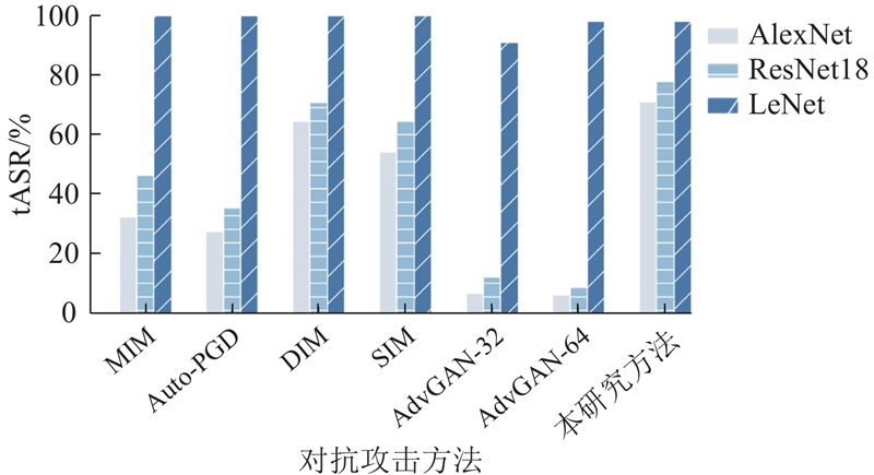 图4展示了攻击方法在MNIST数据集上生成的对抗样本的攻击性能. 在白盒模型LeNet上,所有的攻击方法均表现出较高的攻击性能,其中生成式攻击方法的性能相对较低. 所提方法在AlexNet和ResNet18模型上的目标攻击成功率均优于其他攻击方法,说明所提方法在黑盒攻击方面表现出更强的迁移能力. 其迁移目标攻击成功率比MIM和Auto-PGD高出31个百分点以上,相较于DIM、SIM提升了6个百分点以上,且明显高于AdvGAN.