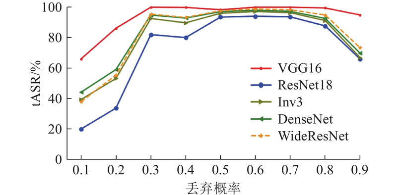 图 7 所提方法在不同丢弃概率下攻击经过对抗训练的模型时的目标攻击成功率