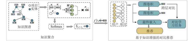... [25 ]将图卷积网络(GCN)扩展到知识图谱推荐系统中,提出知识图谱卷积模型KGCN,通过聚合知识图谱中的项目邻域信息来更新项目特征表示并扩展用户的长期偏好. 为了突出用户-项目交互中的协作信号,Wang等[28 ] 提出协作知识感知注意力模型,通过异构传播策略结合协作信号与知识关联,以提高推荐系统的性能. Hu等[29 ] 将GCN等价为Markov过程,提出Markov图扩散协同过滤模型来泛化基于GCN的推荐模型. 为了提高推荐性能并保证解释的多样性,Ma等[30 ] 提出将用户-项目交互图和知识图谱集成到异质图中,并利用GCN进行实体表征学习,解决了知识图中多跳路径可能导致的错误传播问题. 该类方法结合了基于路径和基于嵌入的方法的优点,在推荐系统中能够进行更精准的个性化推荐. 图神经网络提升了知识图谱推荐的质量和可解释性,但是其有效性依赖于高质量的知识图谱,且容易受到噪声干扰[13 ] . 在真实场景中,知识图谱往往是稀疏且充满噪声的,表现为长尾实体分布. 此外,基于图神经网络的推荐模型大多采用监督学习范式,通常需要大量标记数据进行模型训练. ...