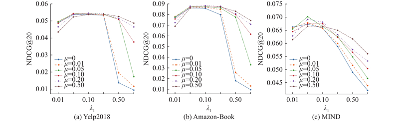 Tab.2 模型 Recall@10 Recall@20 Recall@30 Yelp2018 Amazon-Book MIND Yelp2018 Amazon-Book MIND Yelp2018 Amazon-Book MIND KGAT[26 ] 0.036 5 0.089 2 0.051 8 0.067 5 0.139 0 0.090 7 0.082 7 0.163 8 0.120 3 KGIN[27 ] 0.043 5 0.106 2 0.065 2 0.071 2 0.143 6 0.104 4 0.094 9 0.177 4 0.134 3 CKAN[28 ] 0.039 1 0.087 8 0.059 7 0.068 9 0.138 0 0.099 1 0.085 3 0.162 2 0.128 5 KGCL[32 ] 0.045 5 0.098 9 0.067 6 0.075 6 0.149 6 0.107 3 0.099 9 0.179 5 0.135 9 MGDCF[29 ] 0.041 2 0.104 6 0.067 1 0.079 1 0.155 0 0.106 6 0.102 9 0.181 3 0.136 9 本研究方法 0.051 9 0.115 2 0.071 9 0.085 8 0.169 1 0.115 1 0.112 3 0.203 7 0.141 2