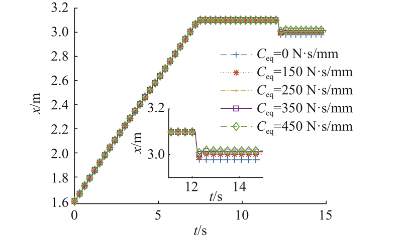 调节磁流变阻尼器等效阻尼系数Ceq,根据表2数据,使等效阻尼系数Ceq=150 N·s/mm,250 N·s/mm,350 N·s/mm,450 N·s/mm. 将其与普通ZQ4000/16/31型巷道超前液压支架(Ceq=0 N·s/mm)进行对比分析,分析指标包括冲击后的顶梁位置x、立柱下腔最大压力Pcol、立柱吸能量Ecol和磁流变阻尼器吸能量Emag.