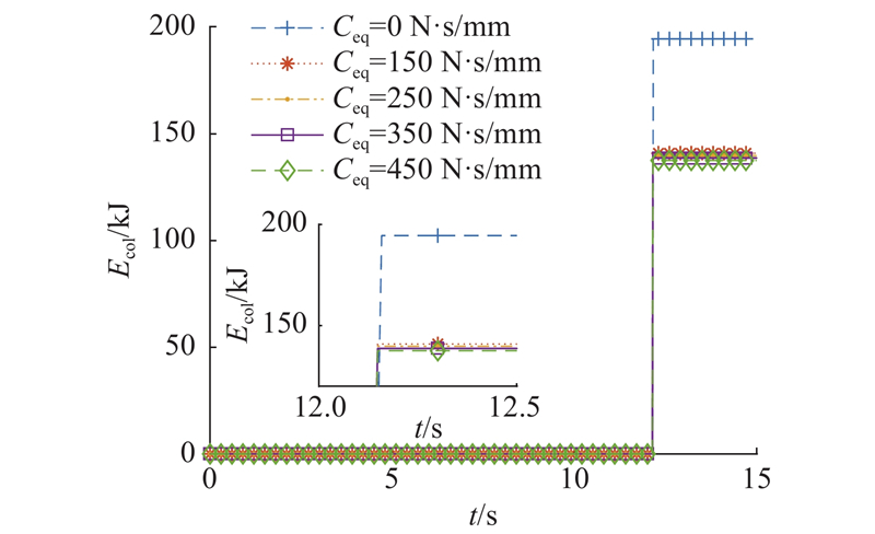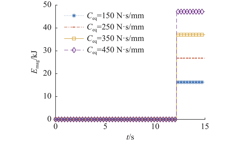 如图19所示,随着磁流变阻尼器等效阻尼系数的增加,磁流变阻尼器吸能量Emag增加. 当等效阻尼系数为150 N·s/mm时,磁流变阻尼器吸能量为16.29 kJ;当等效阻尼系数为250 N·s/mm时,吸能量为26.81 kJ;当等效阻尼系数为350 N·s/mm时,吸能量为37.07 kJ;当等效阻尼系数为450 N·s/mm时,吸能量为47.16 kJ.