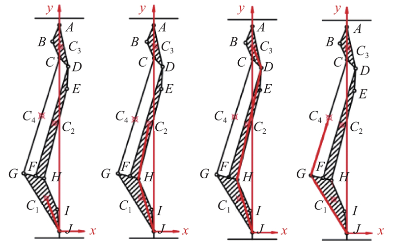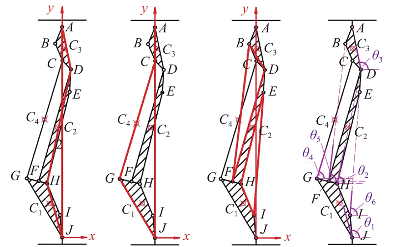 xm和ym分别为点m在直角坐标系x轴和y轴上的位置,其中m取铰链点A、B、C、D、E、F、G、H、I、J以及质心点C1、C2、C3、C4.