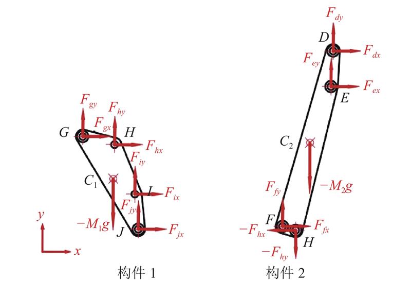 Fig.6 Force analysis of component 1 and component 2 in bionic mechanism