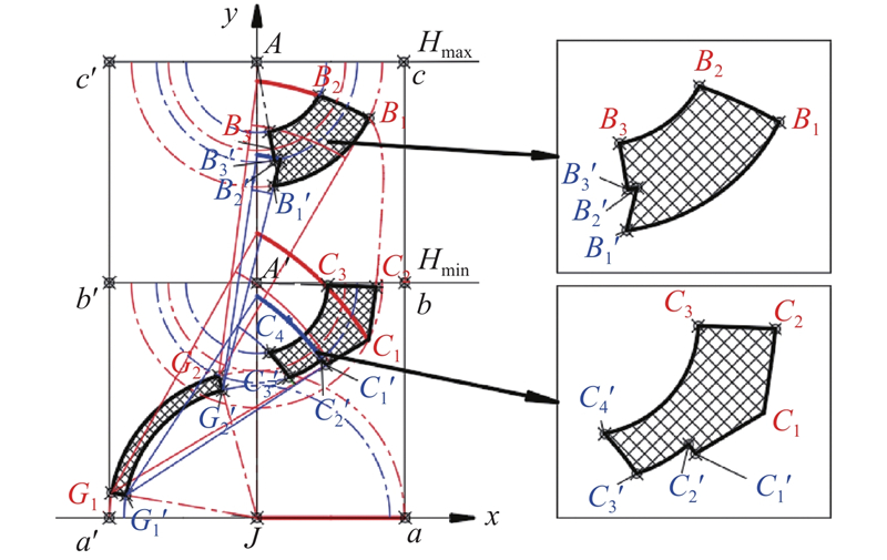 最后,利用MATLAB编写程序,细化优化变量的可行域. 根据机构位置方程,在支架的顶梁高度极限位置SJA=3.1 m与SJA=1.6 m处判断是否有解,从而细化初步的可行域. 此外,在仿生机构支护状态下,应避免处于死点姿态[25]. 细化后,铰链点D、G的可行域如图8所示.图中,a'a为仿生机构最大宽度,a'a=2 000 mm; b'b为支架支护高度下限;c'c为支架支护高度上限. b'b到a'a的距离Hmin=1 600 mm,即ZQ/