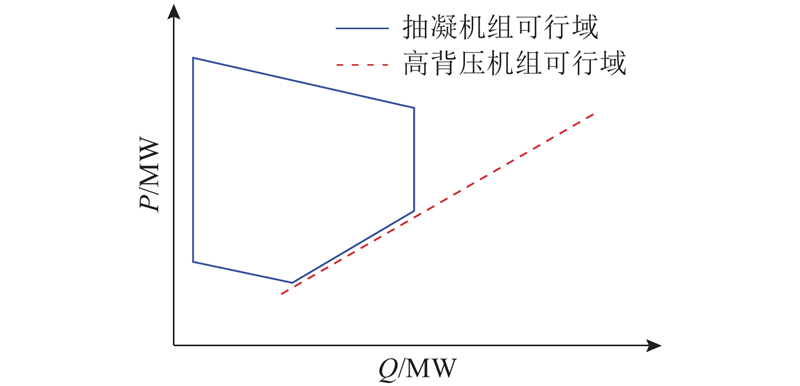 (c)高背压机组可行运行区间约束:考虑机组发电功率上下限,高背压模式下机组的可行运行区间为