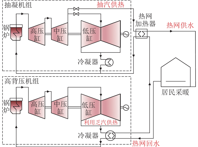 高背压机组通常需要与抽凝机组配合运行(2种机组的结构如图2所示),以保证热电厂整体具有一定的调峰能力,满足系统调峰的需求. 因此,热电厂在改造时不会把所有机组都改造为高背压机组.