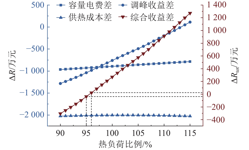 从图9中可以看出,当热负荷需求低于95%时,2种方案的综合收益差为负值,即方案β相比于方案α能够获得更高的综合收益. 但是随着热电厂承担的热负荷继续增加,相较于方案β,热电厂在方案α下运行时能够获得更多的收益. 热负荷需求每增加1%,综合收益差增加约50~70万元.