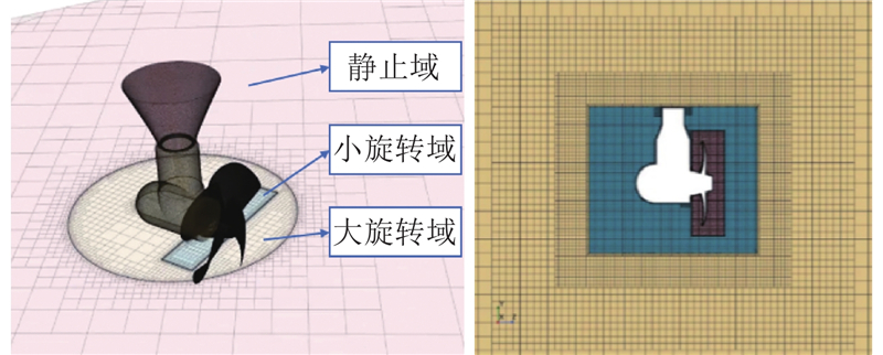 依据已设计完成的8 MW全回转推进器螺旋桨结构,建立三维模型,进行流场仿真,如图1所示,采用滑移网格的方法进行网格划分,推进器为推式推进器,螺旋桨在来流的后方. 流体域分为2个圆柱体和1个长方体,分别为小旋转域(螺旋桨旋转)、大旋转域(回转体回转)和静止域(水域). 小旋转域以螺旋桨轴线为中心,大旋转域以舵体回转轴线为中心. 由于推进器须进行360°回转,此处的静止域为以回转轴为中心轴的长方体.