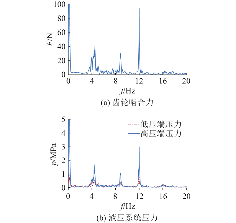 图 10 齿轮啮合力和液压系统压力的频率分析图