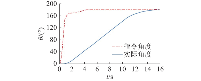 由于现场转舵由操作员控制,其指令变化并非理想阶跃曲线,而是存在一定的倾角,如图12所示. 控制命令为180°时,回转舵体先加速,再匀速,最后减速,指令角度稳定在180.1°,实际角度稳定在179.8°,误差为0.3°,最大转舵速度为16°/s,平均转舵速度约为12°/s.