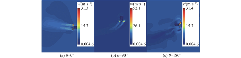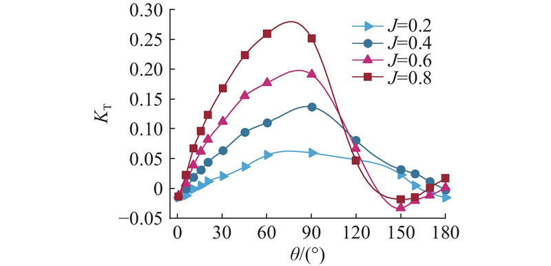 在仿真过程中,将螺旋桨转速设定为实际额定转速n =180 r/min,推进器回转速度为15°/s,分别取进速系数为0.2~0.6,对应的来流速度为