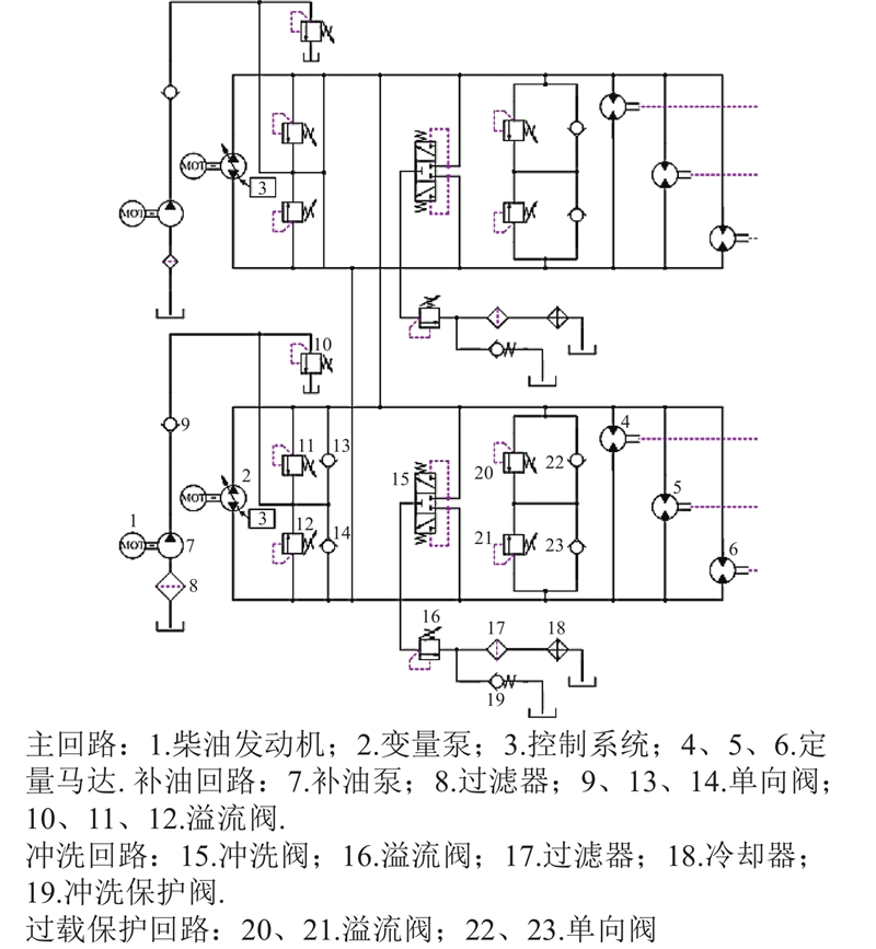 如图7所示为本研究所设计的液压转舵系统简图,其中有以下4个部分:液压系统主回路、补油回路、冲洗回路、过载保护回路[23]. 液压系统主回路:由柴油发动机1、双向变量液压泵2和双向定量液压马达4、5、6组成的闭式回路. 柴油发动机通过一系列的轴传动驱动液压泵2,将旋转产生的机械能转变为油路中的压力能,液压油通过管路被泵送到液压马达,驱动回转齿轮转动. 补油回路:由油箱、发动机1、滤器8、补油泵7、单向阀9/13/14、溢流阀10/11/12等组成,已补充闭式回路油液泄露. 冲洗回路:由冲洗阀15、溢流阀16、滤器17、冷却器18、保护阀19和油箱构成,由冲洗阀从主回路分流一部分油液至旁回路,以提高闭式液压系统中油液的流动速度和换热效率. 过载保护回路:由溢流阀11/12和单向阀13/14构成的主回路溢流阀组以及由溢流阀20/21和单向阀22/23构成的锁闭路溢流阀组成,防止负载突然增大导致系统工作压力突变超过系统所能承受的范围导致系统瞬间崩溃.