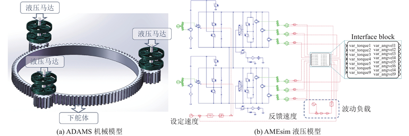 在耦合仿真中,将第1节推进器螺旋桨全回转过程的海水回转载荷数据输入到齿圈上;AMESim液压系统提供给ADAMS机械系统所需的驱动扭矩,克服海水变化载荷,从而驱动齿圈完成指定的回转运动; ADAMS则将角度和角速度传感器得到的角度值和转速值反馈给AMESim中的控制系统;AMESim控制系统则根据反馈信号和指令信号共同计算得出液压系统的输入信号,由此形成“负载-传动-控制”的全回转机液耦合仿真.