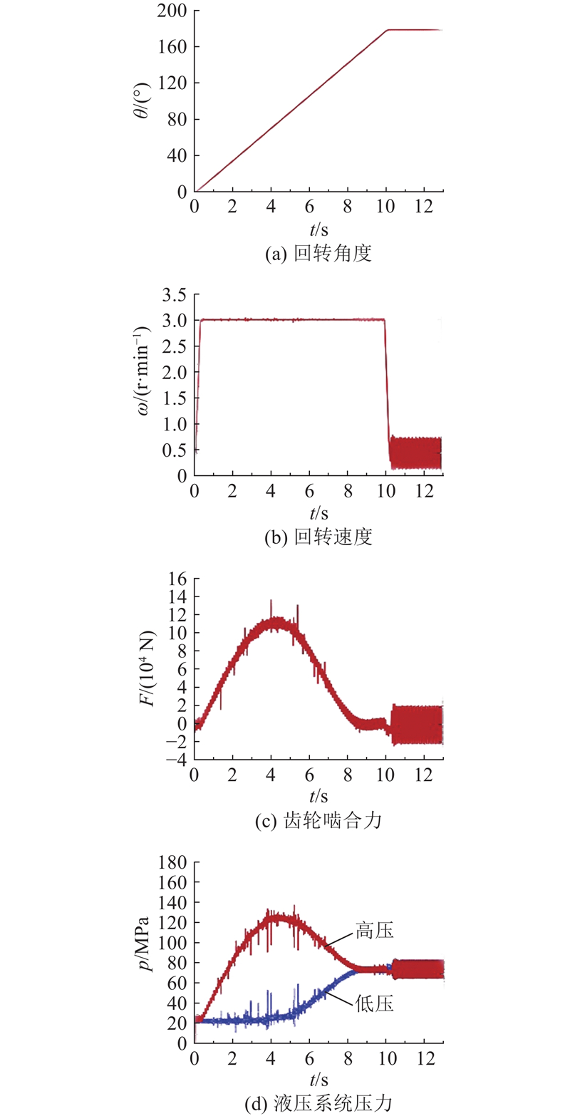 (2)基于水动力获取的回转负载设计液压转舵驱动系统,综合考虑波动负载对系统压力和齿轮啮合力的影响,使用AMESIM和Adams搭建齿轮传动系统和液压控制系统联合仿真模型,使用速度反馈PID控制方法进行回转控制,并对控制结果进行分析.