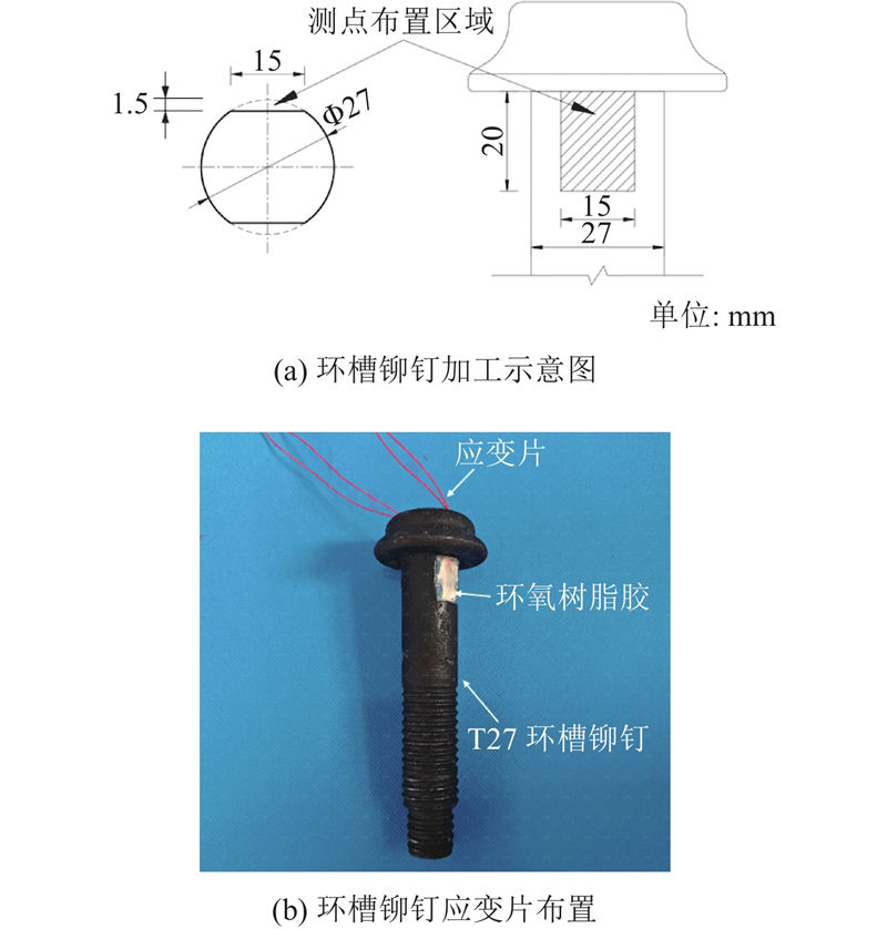 ... 为了保证应变片粘贴牢固,对T27环槽铆钉的铆杆进行加工. 在铆杆两侧钉帽附近切削出2个矩形区域以便于粘贴应变片,如图5 所示. 每根铆钉沿长度方向对称布置2个单向应变片,取两者的应变平均值作为铆杆的平均应变. 测量铆杆轴向应变$ \varepsilon $ ,根据$ P = {E_0}\varepsilon {A_0} $ 计算施铆过程中环槽铆钉的轴力,即铆钉预紧力. 其中P 为环槽铆钉预紧力;E 0 为环槽铆钉的弹性模量,取E 0 =2.1×106 MPa[28 ] ;A 0 为环槽铆钉铆杆上应变片粘贴位置的横截面积. ...