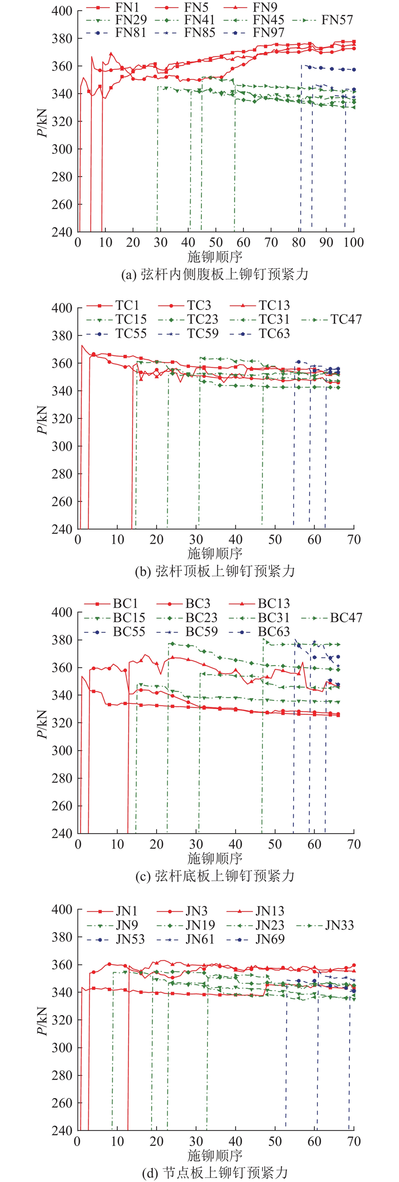 ... 试验前按照《钢结构高强度螺栓连接技术规程》(JGJ 82-2011)[30 ] 所要求的安装工艺布置梅花形冲钉和临时螺栓,两者总数不少于铆钉总数的1/3,且冲钉数量不多于临时螺栓的30%,以消除间隙,保证板层密贴、铆孔对正. 按照图6 中各连接面的铆钉编号从板件中间部分向边缘区域依次进行铆接. 试验采用DH3816N静态应变测试系统对铆接过程中以及铆后48 h内铆钉的轴向应变进行测量. 通常单个铆钉施工时间大约为8~10 s,取开始铆接后的第10 s为铆接结束时间. 试验采用的静态应变采集仪的数据收集周期取总施铆周期的1/20(即采集频率为2 Hz). ...
