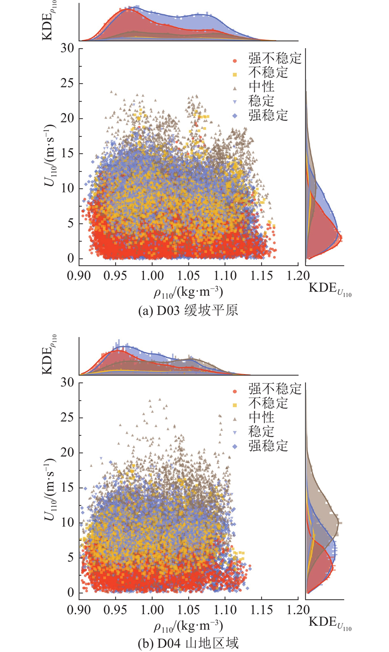 风资源等级的划分标准是风功率密度,风功率密度的主要自变量为风速和空气密度,有必要探究大气稳定度对空气密度的影响. 如图5所示为不同大气稳定状态下风速与空气密度的散点分布及各参数的核密度(kernel density estimation, KDE)分布情况,其中U110、ρ110为各虚拟测风塔110 m处的水平风速和空气密度. 从空气密度的KDE分布情况可以发现,D03缓坡平原和D04山地区域的空气密度分布有共性特征. 在中性大气状态下,空气密度呈双峰分布,且在双峰之间分布较为均匀;强不稳定大气状态空气密度呈单峰分布,且峰值处空气密度偏小,在D03、D04中分别为0.965、0.952 kg/m3. 在强稳定大气状态下,D03缓坡平原和D04山地区域的空气密度在不同的地形下呈现不同特征. D03的空气密度呈双峰分布,峰值处空气密度分别为0.974、1.066 kg/m3; D04的空气密度第2峰不明显,可认为是偏单峰分布,峰值处空气密度为0.958 kg/m3. 这表明,在缓坡平原区域,空气密度更容易受到大气稳定度的影响,山地地区由于地形对流场的复杂干扰,导致空气密度分布趋于更加稳定的单一值. 无论是D03还是D04,强稳定大气状态的峰值空气密度均高于强不稳定状态下的峰值空气密度. 因此,相比强不稳定状态的空气密度分布,强稳定状态下的空气密度分布趋向高值. D03中性、强稳定、强不稳定状态下空气密度的平均值分别为1.028、1.021、1.003 kg/m3;D04中性、强稳定、强不稳定状态下空气密度的平均值分别为1.012、0.995、0.983 kg/m3. D04由于整体海拔较高,空气密度低于D03. 结合空气密度在不同大气状态下的分布及平均值,将大气稳定状态按空气密度由大到小排列如下:中性、强稳定、强不稳定. 分析原因,在中性大气状态下,温度和密度分布最接近大气的标准状态,因此密度相对最大;强稳定状态限制了热量传递和对流,由于空气层间隔较少混合,虽然局部可能会有较大的密度,但整体空气密度分布会因为逆温效应而略低于中性状态;在强不稳定状态下,上升的暖空气会导致整个大气柱的平均密度降低. 从风速的KDE分布图可以看出,各种大气稳定状态下风速均呈现单峰分布,按风速由高到低的排序为中性、强稳定、强不稳定.