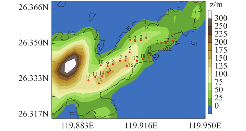 如图3所示为风电场内风力机编号及海拔z. 风力机之间保持一定距离,沿西南向东北延伸的半岛山地地形分散呈带状布置,覆盖不同海拔和地理位置,形成多点分布的网络,以最大化利用风能资源. 1~4号机组北侧和西北侧地形起伏较大(局部最大相对高差为130 m);5~15号机组西北侧起伏约200 m;16~20号机组处于背风坡;21~24号机组海拔约50 m,周围除西北侧外地形均相对平缓.