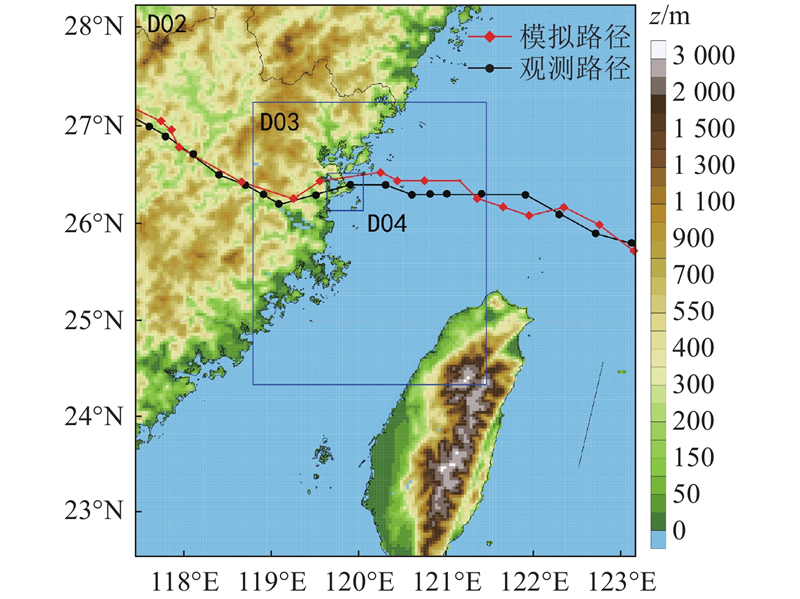 如图4所示为“玛莉亚”台风的观测路径与模拟路径对比图. 可以看出,采用WRF模拟得到的台风移动轨迹与观测台风轨迹基本一致,表明模式所选用的参数化方案可靠.