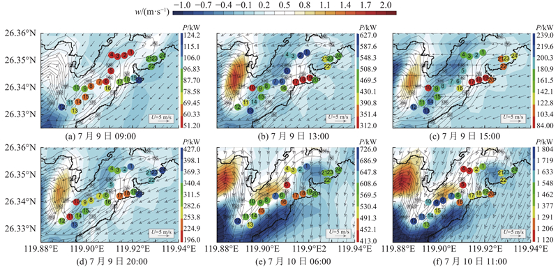 如图8所示为受台风外围环流影响前不同时刻风电场内机组功率输出图,其中w为垂直风速. 7月9日9:00,来流风速小于5 m/s,位于高海拔山脊处的机组功率输出普遍较低(如1~8号、14~15号),随着海拔升高,沿顺风方向功率输出逐渐增大. 山谷风加速作用导致9~12号机组来流风速大,功率输出较大;尤其11~12号机组位于山谷收缩处,功率输出明显. 地形对海拔较低的17~24号机组的来流风速影响小,功率输出较大,其中17~19号机组间存在尾流干扰. 表明低风速条件下,风电场机组功率输出呈明显的地形调控特征,高海拔山脊处机组受阻功率偏低,山谷收缩处机组受风速加速影响功率显著提高. 7月9日13:00,来流风速增大至5 m/s左右,风向为东北风. 高海拔山脊处机组功率输出沿顺风方向逐渐降低,机组之间存在明显尾流干扰(如1~4号,5~15号). 对比1~3与21、23、24号机组功率输出,上游机组对下游机组功率输出产生干扰;高海拔区,3号比1号低80 kW左右,低海拔区,21号比24号低80 kW左右;在相同风向下,24号比1号低80 kW左右,表明风电场内部存在显著的顺风方向尾流效应与功率衰减规律,上游机组的运行对下游机组功率输出产生明显干扰,且尾流影响范围较大. 7月9日15:00,低海拔区80 m高度来流风速低于5 m/s,高海拔区风速较高,地形遮挡导致气流流过山脊后,风向偏转为东风. 海拔较高的1~16号机组(除10号以外)功率输出较高. 10号机组海拔比9号机组低约70 m,功率输出受来流区机组干扰严重. 低海拔区的16~24号机组功率输出较低,此时16~24号机组沿顺风方向排列,上游机组对下游机组产生明显尾流干扰. 1号比24号功率高40 kW左右,这表明在复杂地形条件下,地形加速效应、风向变化及尾流干扰共同决定了机组的功率输出分布. 7月9日20:00,风速持续增大,地形对风向的影响变小. 低海拔区来流风速大,受地形影响,高海拔风速较小. 整场功率输出沿顺风方向逐渐减小,上游机组尾流对下游机组功率输出干扰严重. 7月10日6:00,整场风向为北风,来流风速为7 m/s. 此时,1~4号、7~12号机组均不受尾流干扰影响,其中12号机组受山谷风加速影响,功率输出较高;1~4号机组功率输出出现异常,其中1、2号明显高于3、4号,由于1~3号机组海拔相差不大,海拔不是造成功率异常的原因,但1~4号机组来流区的地形起伏依次增大,表明在该风向下,1~4号机组位置的来流区地形起伏程度决定了机组的功率输出. 5、15~18号机组位于背风区,受到上游机组尾流干扰,功率输出低于迎风坡机组约100 kW. 表明尾流效应与复杂地形共同作用会显著削弱下游机组的风能利用效率. 7月10日11:00,整场风向为东北偏北风,来流风速为10 m/s. 高海拔区风速较高,7~12号机组功率输出显著,3~4号机组对下游5~7号、16号机组产生干扰,造成功率亏损. 13~15号机组也受到上游机组尾流干扰,功率输出出现亏损. 处于背风区的16~20号机组功率输出受地形遮蔽作用影响,功率输出出现亏损. 在该风向下,当不受尾流干扰时,1~4号机组功率输出依次减小,与7月10日6:00类似. 表明在特殊地形作用下,地形起伏对来流风场特征与机组功率输出的决定性作用.