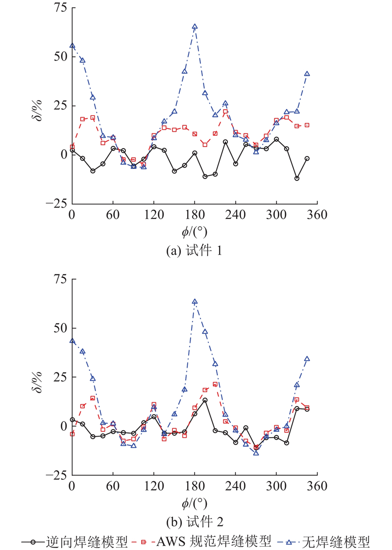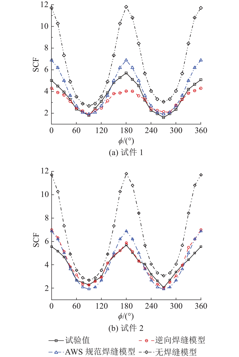 ... 将3种有限元计算结果与试验数据进行对比分析. 对于支管焊趾部位,3种有限元模型计算的SCF与试验数据的比较如图17 所示. 可以看出,3种有限元模型的计算结果变化规律与试验数据相符;无焊缝模型的计算结果明显大于试验数据,这与文献[9 ]、[12 ]~[14 ]的结论一致,主要原因是焊缝能够在一定程度上增加管节点的刚度[29 -30 ] ,导致SCF减小;AWS规范焊缝模型、逆向焊缝模型的计算结果与试验数据接近. 对于弦管焊趾部位,3种有限元模型计算的SCF与试验数据的比较如图18 所示. 可以看出,AWS规范焊缝模型、逆向焊缝模型的计算结果变化规律与试验数据相符,无焊缝模型的计算结果与试验数据的变化规律不同;AWS规范焊缝模型、逆向焊缝模型的计算结果变化规律与试验数据接近. ...
