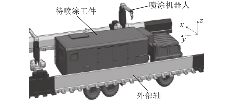 六轴喷涂机器人本体作业范围有限制,为了满足大型部件的自动喷涂要求,通常会配置外部轴与机器人本体进行联动以拓展作业范围. 在当前工业机器人主流构型中,具有中空非球形手腕的7R 6-DOF(六自由度)喷涂机器人因运动范围广、灵活性高,被广泛应用于喷涂作业[4]. 当机器人配置外部轴后,系统总自由度将超过6个,导致机器人运动冗余. 在这种状态下的机器人具有无穷多个逆运动学解,使得机器人系统的灵活性更高,若不采用合理的机器人轨迹规划策略,极可能产生机器人本体与外部轴运行不匹配导致轨迹不平滑,引发系统的抖动现象,影响喷涂质量和缩短系统使用寿命. 因此,在设计和应用冗余机器人系统时,应特别关注轨迹规划策略的合理性,确保系统稳定且可靠.