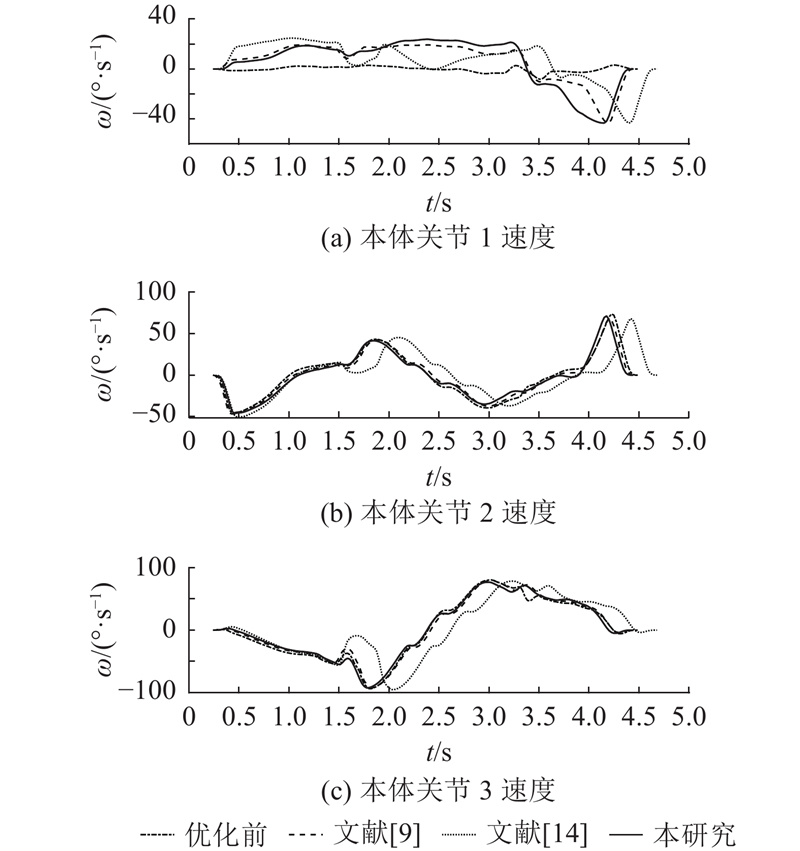分析优化前和采用不同算法优化后外部轴和本体1、2、3轴在喷涂过程的轨迹、速度和加速度变化情况,如图12~17所示. 由图12可以看出,算法优化后机器人的外部轴移动幅度明显降低,采用所提算法优化后的外部轴轨迹较对比算法优化的效果更佳. 结合数据可知,采用所提算法优化后,机器人的外部轴运动幅度较优化前的降低了58.7%,较GA-PSO算法的降低了17.8%,较改进模型退火遗传算法的降低了21.0%. 由图16可以看出,采用所提算法优化后的外部轴最大加速度较优化前的大幅减小,相较于对比算法均有所减小,说明外部轴关节冲击得到明显改善. 结合图13、15、17分析可知,算法优化前的机器人末端执行器线速度主要由外部轴提供,算法优化后,机器人通过外部轴与本体轴之间配合使末端达到指定线速度,即优化后冗余机器人外部轴与本体轴之间耦合度提高. 由喷涂仿真可知,在执行曲线喷涂任务中,算法优化前的机器人系统能量损耗为4 367.1 J,经GA-PSO算法优化后为3 289.3 J,经改进模型退火遗传算法优化后为3 448 J,经所提算法优化后为3 196.2 J. 所提算法优化的机器人系统能量损耗相较于优化前的降低了26.8%,相较GA-PSO算法优化的降低了2.8%,相较改进模型退火遗传算法优化的降低了7.3%. 该结果验证了所提算法的有效性.